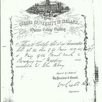 College records show that John Berry entered the College in the 1858-9 Session, aged 17, in the School of Engineering. His father was Thomas Berry, his religion Protestant, and his address Durrow, Queen's County (i.e. Laois). His school was Hawthorn Hall, Manchester. According to further similar Certificates copied to us by Gordon Berry (see below), he completed the Second Engineering course in the Session 1860-61 and was awarded 'a Prize of the second rank in Engineering' at the close of that Session. There is no further record of him, and he does not appear among the graduates of the College, of the Queen's University in Ireland, or of the Royal University of Ireland (which replaced the Queen's University in 1882). A note from Gordon Berry records his date of birth as May 25, 1841 at Tullamore, King's County (i.e. Offaly).
