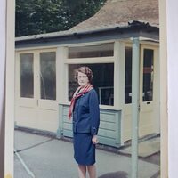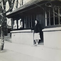 Mrs Creaven ('Ma Creaven') outside the university coffee shop Mrs. Creaven (known as 'Ma Creaven') pictured in the doorway of pavilion building, which served as the university coffee shop. Mrs. Creaven managed the coffee shop for many years. Note the notices displayed in the window of the coffee shop, which usually related to forthcoming college-related social and sporting events.