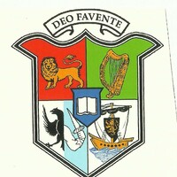 Arms of QCG, UCG, NUI Galway and University of Galway / Ollscoil na Gaillimhe These are the arms of Queen's College, Galway, University College, Galway (Coláiste na hOllscoile, Gaillimh), National University of Ireland, Galway (Ollscoil na hÉireann, Gaillimh), and the University of Galway (Ollscoil na Gaillimhe). The Arms, dating from the earliest days of Queen's College, Galway, comprise a blue inescutcheon or shield divided into quarters, describing, in increasingly specific terms, the location and purpose of the College. The first quarter, against a red background, a golden lion walking towards the left with full face towards the spectator, represents England; the second quarter, against a green background, a golden Irish harp with silver strings, represents Ireland; the third quarter shows the arms of the province of Connacht - specifically, in the left half, against a silver/white background, a black eagle, halved, with wings expanded, and in the right half, against a blue background, a bent arm holding a dagger erect (natural colouring); and the fourth quarter shows the arms of the town of Galway, viz. against a silver/white background, a golden galley, riding on the waves of the sea (natural colouring), with one mast and sail furled, the rigging bearing a black shield on which a golden lion appears in profile, standing on the left hindleg, the right hindleg raised above it and the forelegs elevated. The open blank book superimposed on the centre point is a standard heraldic symbol for an institution dedicated to learning. The motto on the scroll surmounting the arms, in Latin, is ‘Deo Favente’ (‘With God’s Favour’).
