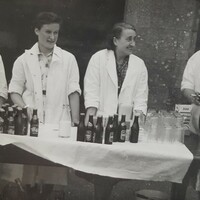 Catering Staff in Quadrangle This group of four women comprised the catering staff of the university coffee shop. The coffee shop was located in a former sports pavilion on campus, and from its establishment in 1952/53 was the only place on campus where refreshments could be purchased. The coffee shop staff occasionally catered for other events on campus, and this image appears to depict an outdoors event taking place in the college Quadrangle. It may have been to celebrate a sporting event or it may have been one of the annual end of academic year parties which were held for academic staff in the Quadrangle, the exact nature of the event is unclear. Pictured on the extreme right is Mrs. Creaven, affectionately known to generations of students as 'Ma Creaven' who managed the coffee shop with her team from its opening until her retirement in 1975. Apart from Mrs. Creaven the other women in the photo are unidentified.