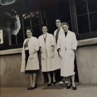 Catering Staff Coffee Shop This is a group of four women who comprised the catering staff of the university coffee shop. The coffee shop was located in a former sports pavilion on campus, and from its establishment in 1952/53 was the only place on campus where refreshments could be purchased. Second from right, at rear, is Mrs. Creaven, affectionately known to generations of students as 'Ma Creaven' managed the coffee shop with her team from its opening until her retirement in 1975. On her retirement the running of the coffee shop was taken over by Peggy Jordan, and it became known as 'Peggy's'. Apart from Mrs. Creaven the other women in the photo are unidentified.
