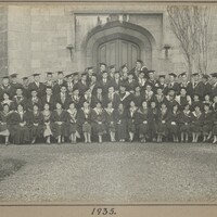 UCG Graduates group photo 1935 This is a graduation photo taken on the steps of the entrance to the Aula Maxima, in the Quadrangle of University College Galway. The handwritten date on the photograph indicates that this was the graduation class of 1935, which according to the UCG College Calendars comprised of B.A., B.Comm. B.Sc. MA and H.Dip.Ed. graduates.