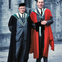 On the right, Tom O'Connor (1931-2012), who had been appointed a lecturer in Physics in 1956, is seen here on the day of his PhD conferring. Featured in several photographs in this Collection (q.v.), he was a leading figure in his field and is particularly noted for the creation of the Mace Head Atmospheric Research Station.