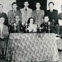 Group of students with Professor Diarmuid Murphy and Christy Townley This appears to be a group of students accompanied by two college staff - Christy Townley (standing at back, extreme left) and Professor Diarmuid Murphy, professor of English, seated second from left). The table laden with trophies appears to indicate that this was the UCG Drama Group which was successful in winning a number of trophies for their theatrical productions. An Cumann Drámaíochta, the college based Irish language drama group, was also very successful in staging Irish language productions.