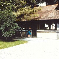 Coffee Shop The university coffee shop, presided over by Mrs. Creaven (known affectionately to all as 'Ma Creaven') was for many years the only place available on campus to purchase refreshments. A former sports pavilion, it was the social hub of the college and notices for all sporting and social events were displayed in its windows or on its interior walls. It appears to be Spring or early Summer, as the sun is shining, an unidentified woman wearing white sunglasses is pictured about to enter the building, and under an adjacent tree a group of unidentified students are seated at a picnic table.