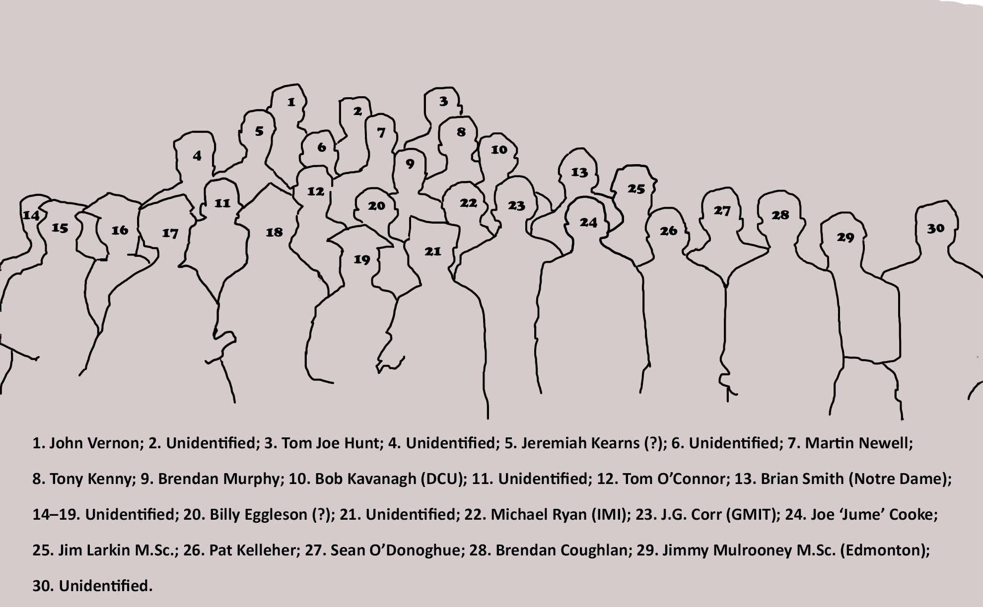 Among those present in this photograph are members of staff Martin Newell, Tom O'Connor and Breandán Ó Cochlain. Some of the graduates are still to be identified but the others are named in the accompanying key.