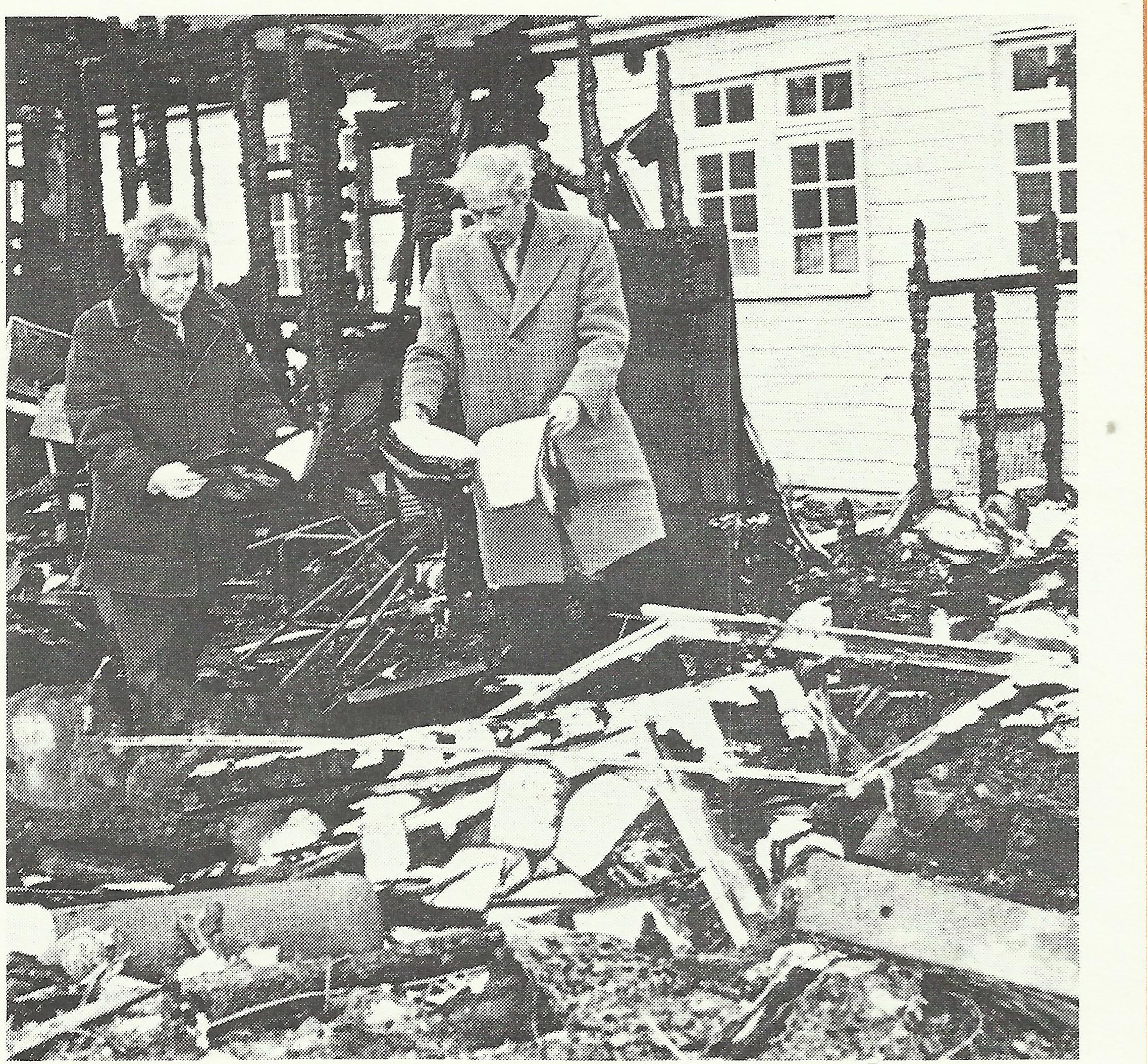 In the second photo, Professor L. Kieran Dunican (right) and Dr Jim Houghton are shown sifting through the wreckage.
