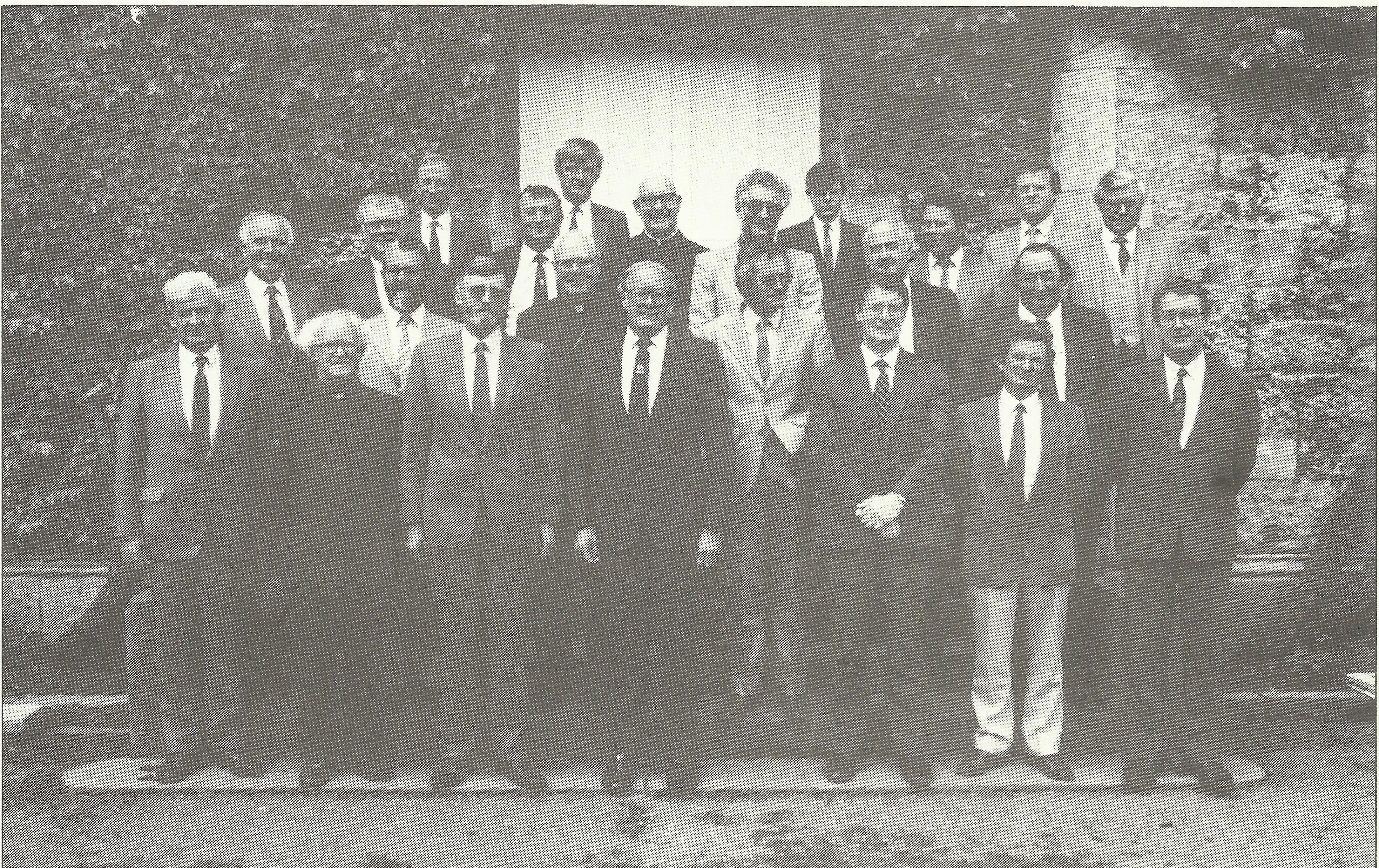 (Front row, from left) Séamus Ó Cathail (Academic Secretary / Rúnaí Acadúil), An tOllamh Eustás Ó Héideáin (elected by the Graduates), Dr Hubert McDermott (elected by the Graduates), Dr Colm Ó hEocha (President/ Uachtarán), Professor Patrick F. Fottrell (Registrar/ Meabhránaí), Micheál A.G. (Gearóid) Ó Tuathaigh (elected by the Graduates), Dioraí Ó Coirbhin (Secretary-Bursar / Rúnaí-Sparánaí). (Second row, from left) Seán McManus (elected by Sligo Co. Council), An tOllamh Déaglán Ó Caoimh / Professor J.D. O'Keeffe (elected by the Academic Council), Most Rev. DrJoseph Cunnane (elected by the NUI Senate), Professor James J. (Jim) Ward (elected by the Academic Council), Mícheál Ó Móráin (elected by Galway Co. Council), An tOllamh Pádraig Ó Céidigh (coopted). (Third row, from left) Pascal McKeon (elected by Leitrim Co. Council), M.P.J. (Bobby) Curran (elected by the Graduates), Most Rev. Dr Michael Harty (Bishop of Killaloe; nominee of Clare Co. Council), Seán Stewart (elected by the NUI Senate), Páraic Ó Coscara (elected by Mayo Co. Council), An tOllamh Proinsias Mac Giollarnáth (coopted). (Back row, from left) Dr Rex S. Dark (elected by the NUI Senate), Patrick Dooney (elected by Roscommon Co. Council), Brendan Wilkins (President, Students' Union / Uachtarán. Comhaltas na Mac Léinn), Daniel (Don) Collins (coopted).