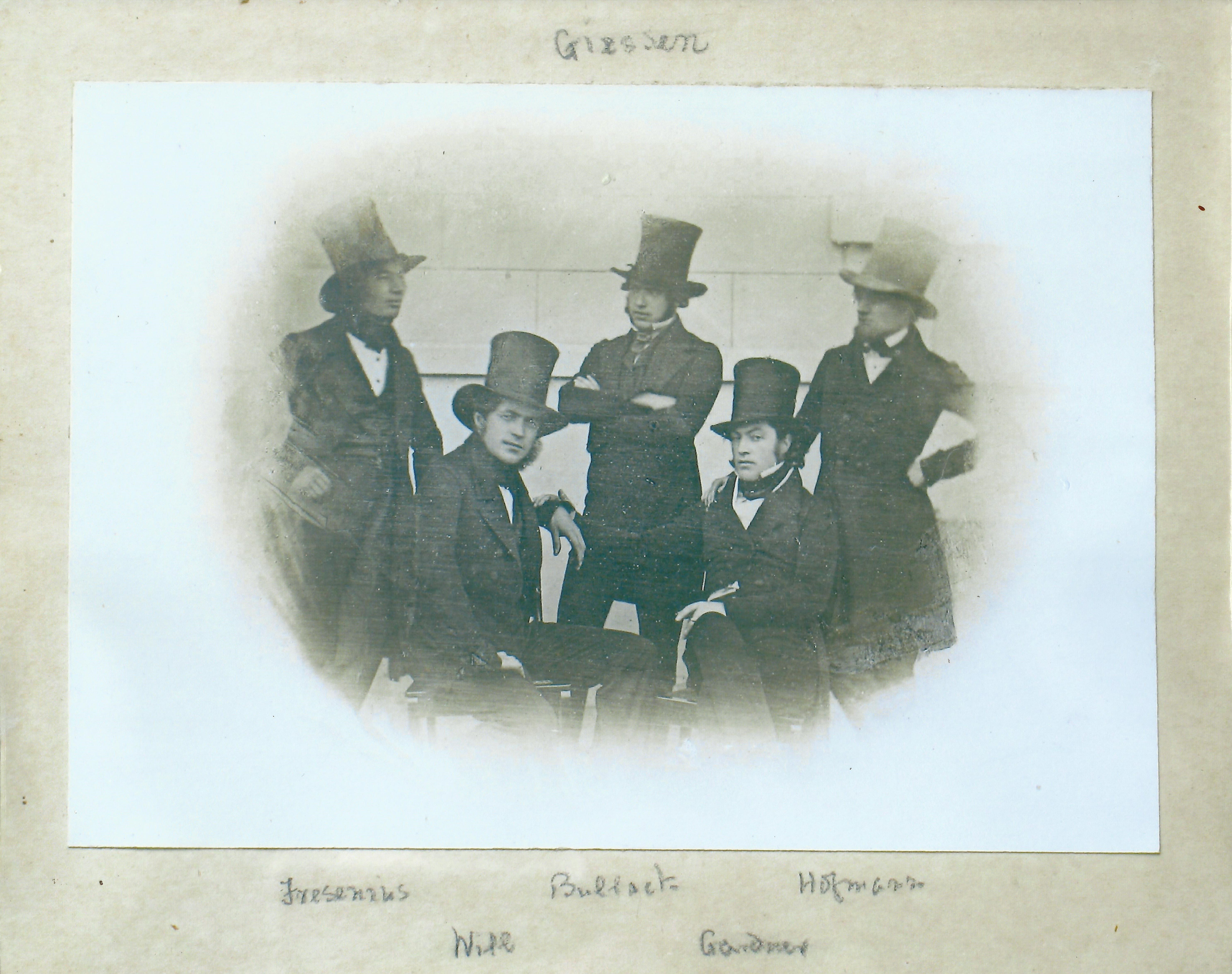 This 19th century photograph, reproduced from glass plates in the Chemistry Department, shows Prof. A. W. von Hofmann (extreme right) from Giessen University (Germany) and later the Royal College of Chemistry in London, with four other key Chemistry figures linked to Liebig's pioneering School of Practical Chemistry at Giessen. Hofmann, according to Prof. R.N. Butler, for over seventy years had 'an enormous influence on the development of Chemistry in Great Britain and Ireland generally, and Galway in particular', influencing Chemistry in Galway directly from 1849 to 1918 through the Professors in Galway who had worked under or with him, viz. Edmund Ronalds (1849-56), Thomas H. Rowney (1856-89), Augustus E. Dixon (1889-91) and Alfred Senier (1891-1918), and indirectly Edward Divers (Assistant in QCG, 1854-66 and later the first Professor of Chemistry at the University of Tokyo). The survival in the Department of Chemistry ever since of this glass-plate photograph of those early figures associated with Liebig's School is in itself evidence of the continued memory in Galway of the historic link between Giessen and the development of Chemistry in Galway.