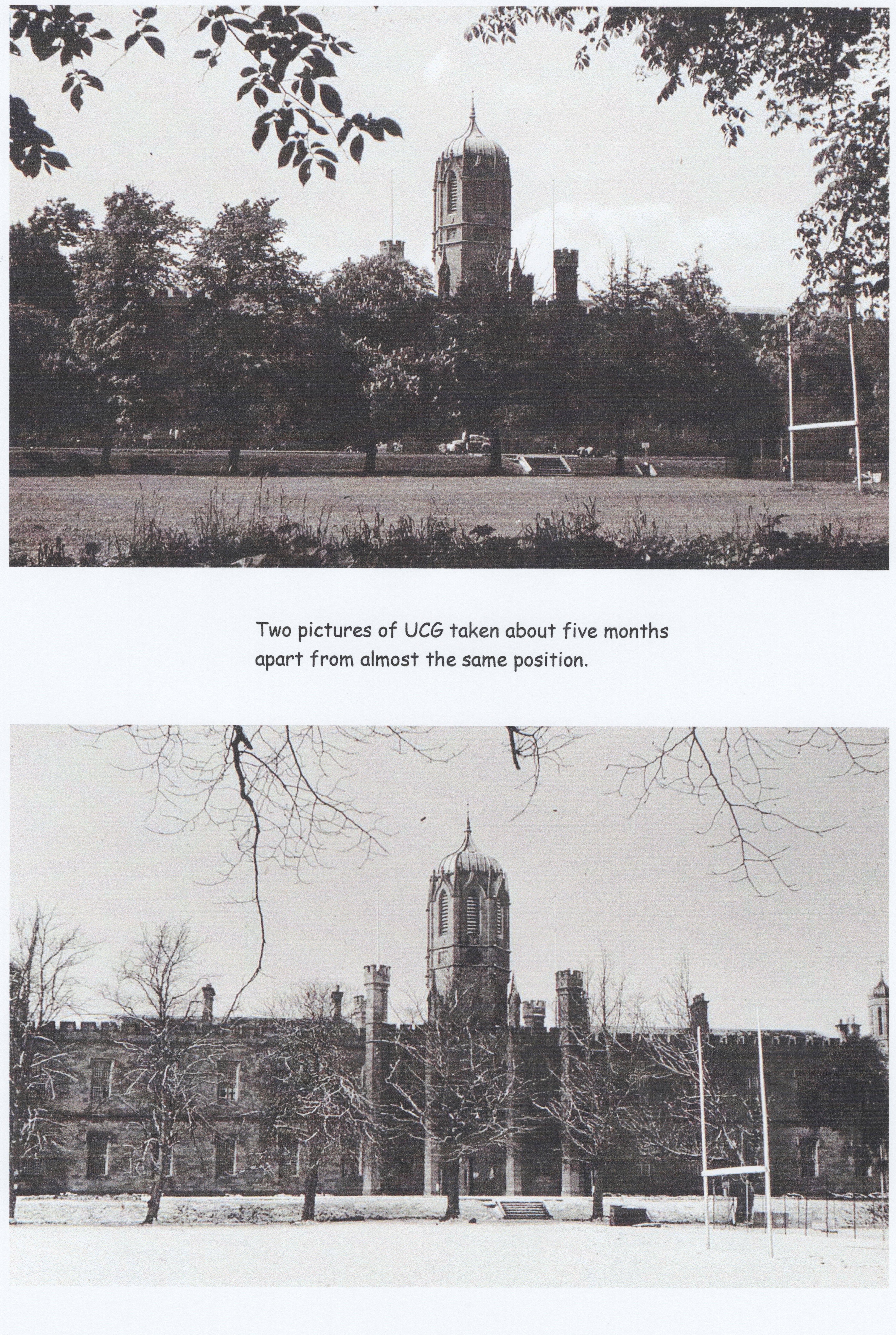 Two pictures of UCG are shown, with the upper picture with the clock tower and turrets mainly in view, due to trees being in full foliage. The sports field in the foreground along with goalposts is also to be seen. The lower picture about five months apart, and from approximately the same location, shows a clear view of the University, due to the trees being now bare.