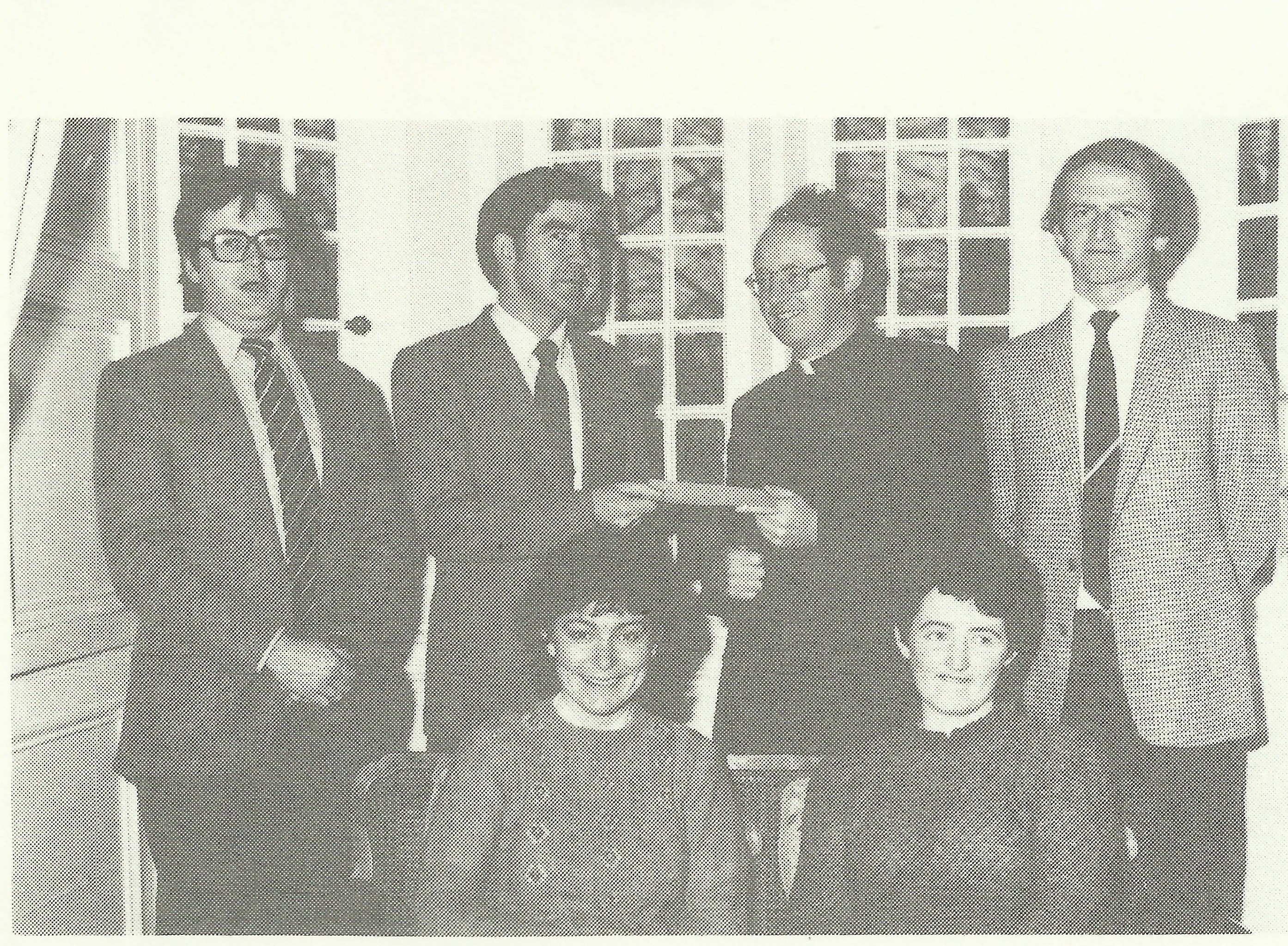 Distribution to a number of charitable organisations by An Ciste Carthanachta of funds it had raised from UCG staff. An Ciste Carthanachta (= 'The Charity Fund') was run by a staff committee as an annual fundraising drive among staff for a variety of charities. The photo was taken at the distribution of the £2,100 raised in 1984-5 to representatives of St Vincent de Paul Society (£500), An Cheathrú Rua Drowning Tragedy Fund (£100), the Parents and Friends Committee of the Holy Family Special School for Mentally Handicapped (Renmore), the Tagaste Youth Projects (£1,000), and the Simon Community (£100).