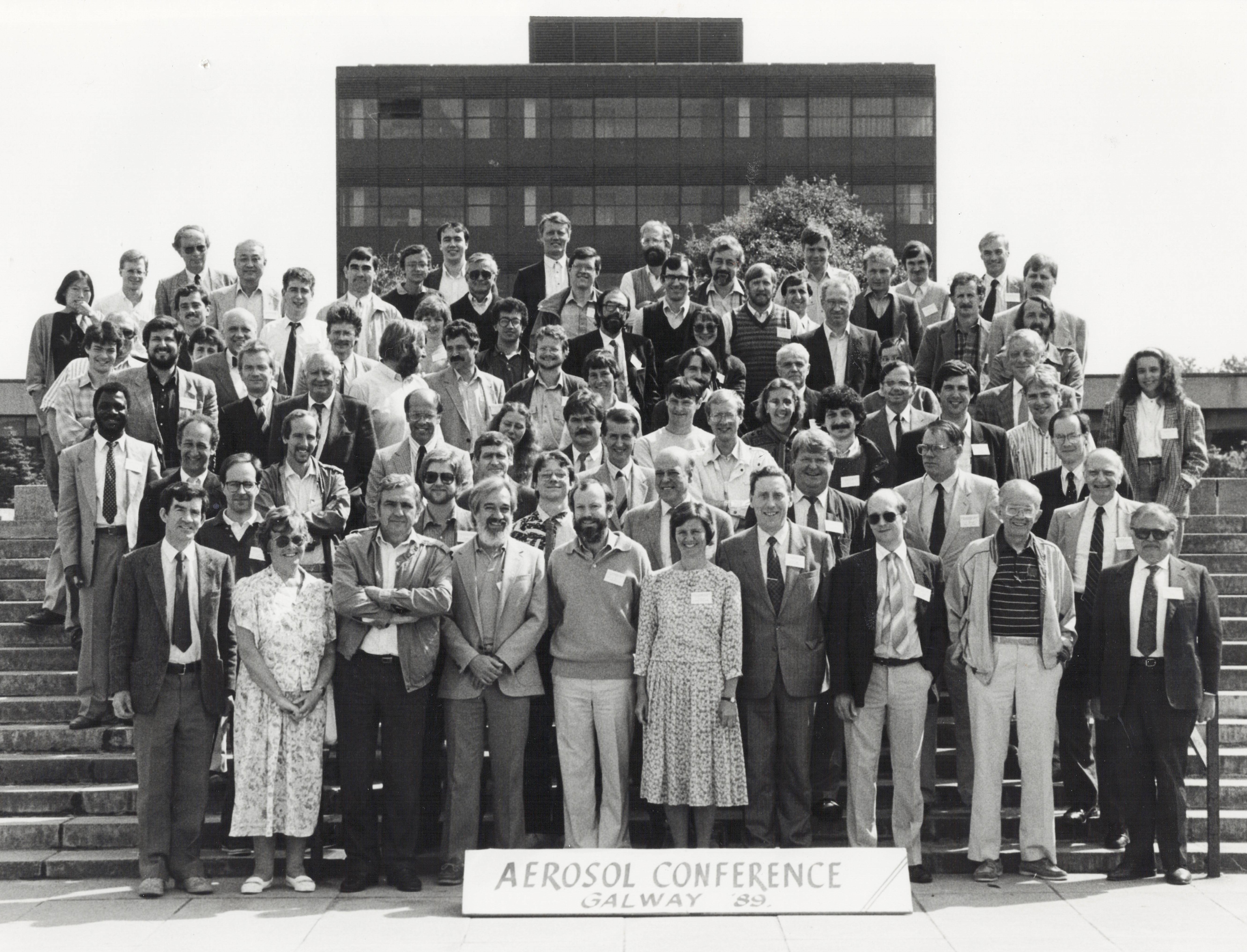 Picture 1: A large group of people standing on steps with a building at the rear, with a placard at the front, bearing the words ‘AEROSOL CONFERENCE GALWAY 89’