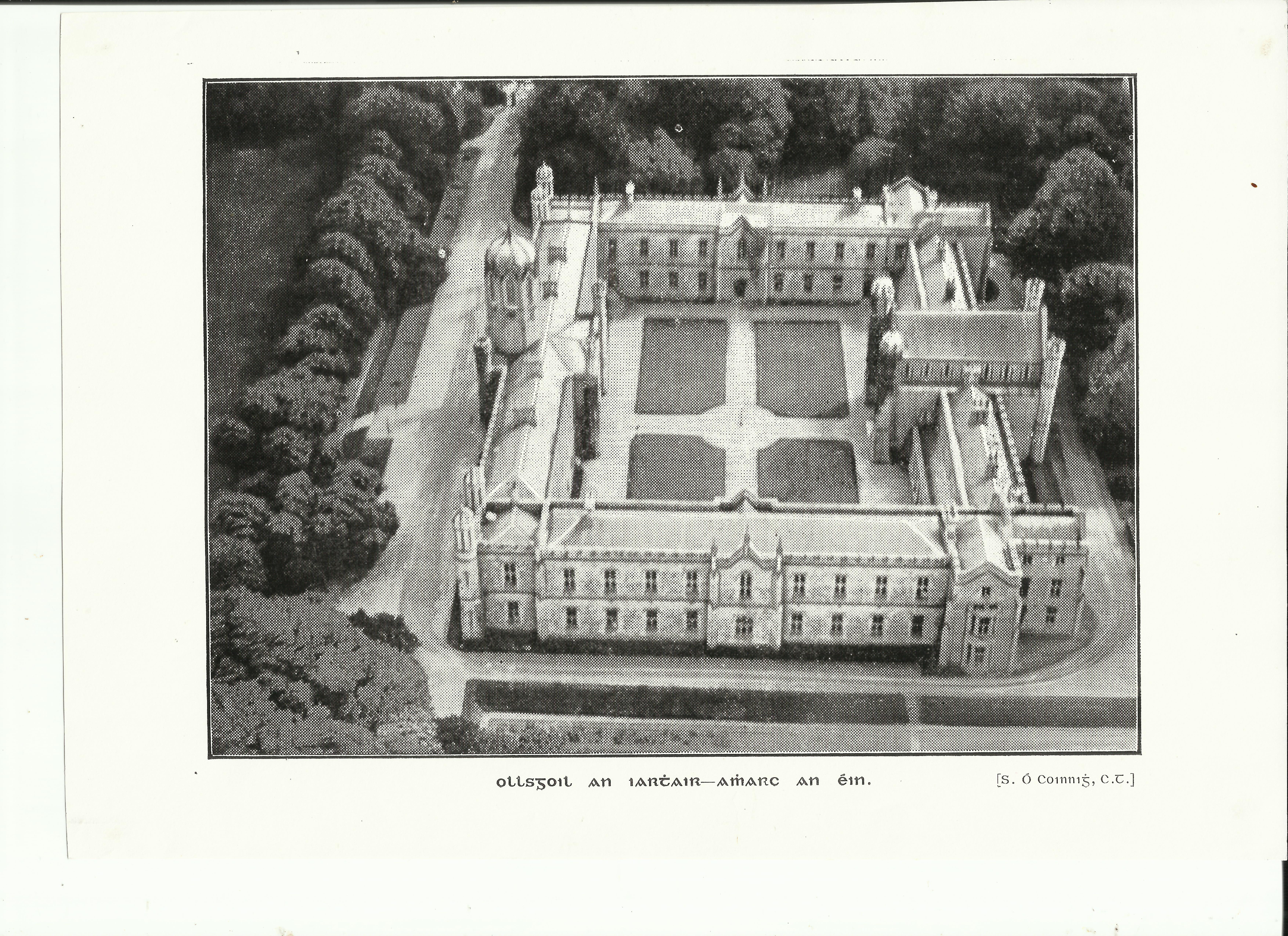 Aerial photograph of the Quadrangle, surrounded by trees, looking south. The date of the photograph is unknown, but, judging from the presence still of the old lamp standard at the centre of the Quadrangle, the apparent scarcity or possibly absence of cars (the image is unclear), the appropriateness of the Irish-language caption to the new role assigned by the 1929 Act to the College in relation to the provision of University education through Irish, and the use in it of the Cló Gaelach (which started to decline in favour of the Cló Rómhánach around 1950), the photograph was probably taken in the 1930s or 1940s. The caption itself, OLLSGOIL AN IARTHAIR - AMHARC AN ÉIN (= 'University of the West - Bird's-eye View'), credits S. Ó Coinnigh, C.T. for the photograph: this was obviously a Connacht Tribune photographer of that name, possibly related to Tom 'Cork' Kenny, editor of that paper till 1940. 'OLLSGOIL' is the old spelling of 'OLLSCOIL'.