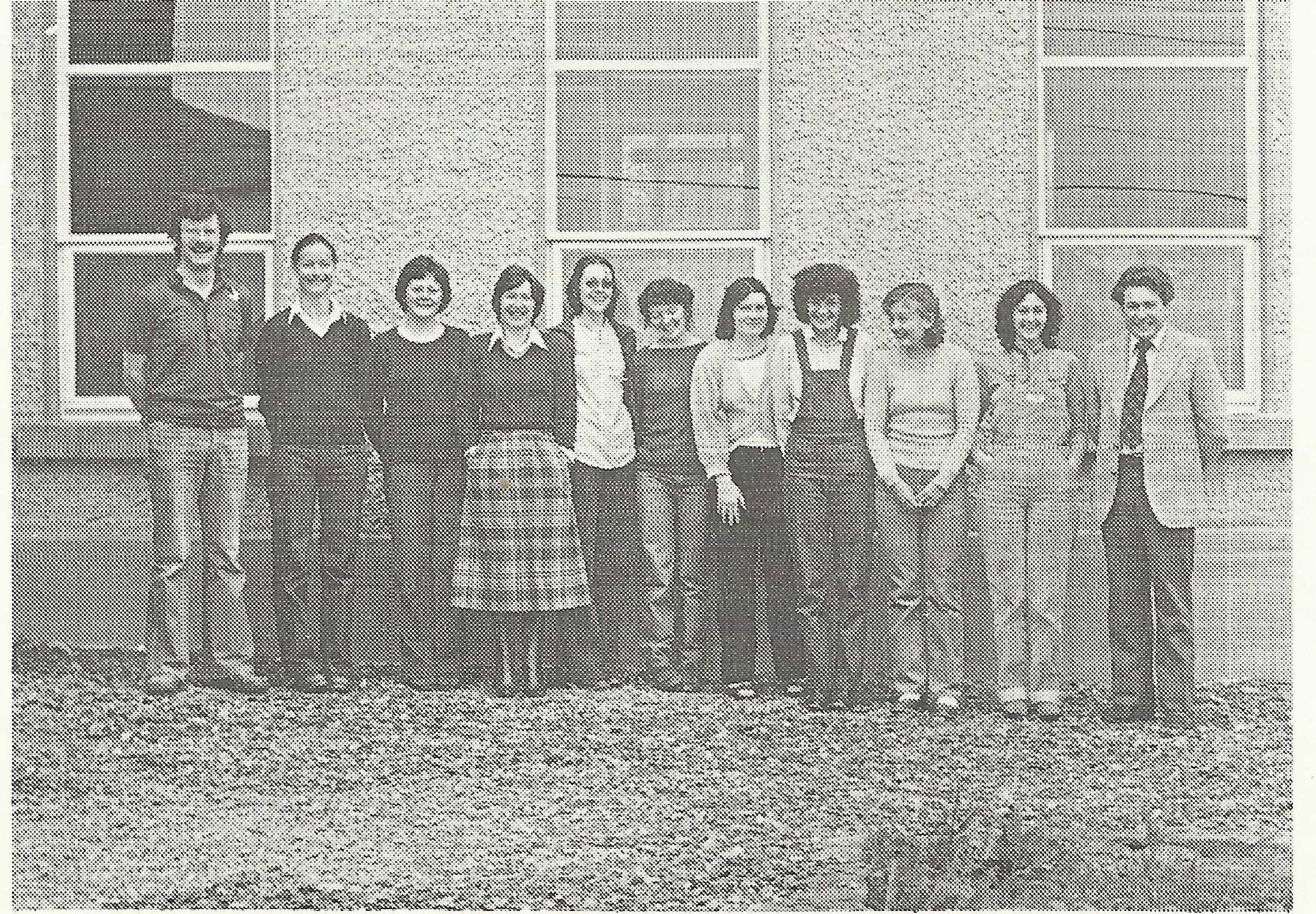 (These are members of the Administration (along with staff of the course) who completed a course in Irish and Administration in Áras Mháirtín Uí Chadhain, An Cheathrú Rua in Summer 1979 standing outside the Áras. Two such courses were delivered that year, attended by 14 members of administrative staff.)