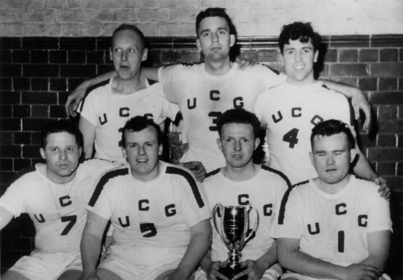 This image is of the UCG Basketball team, who were Intervarsity Basketball Champions from 1950-53. The team was largely comprised of American students who had come to UCG to study Medicine in the post-WWII period, some of them as part of the G.I. Bill. The only non-American in the group is John McLoughlin, who was from Liverpool. The team persuaded one of their landladies to cut out the letters and numbers in maroon-coloured fabric, and sew them onto their white t-shirts, ensuring that the team made quite an impression on their opponents from the other Irish universities.
